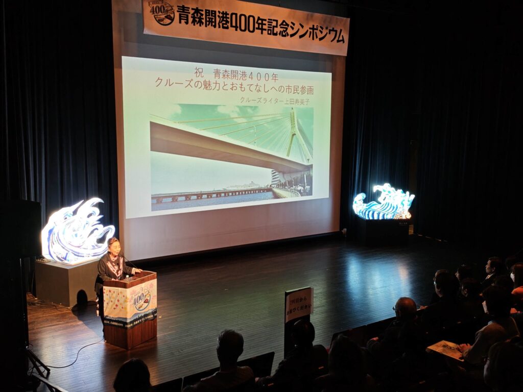 第一部、クルーズライターの上田寿美子さんによる基調講演では、日々進化を続けるクルーズ船の魅力や楽しみ方、横浜発の飛鳥Ⅱで青森を訪れた際のねぶた体験、持続可能なおもてなしのヒントを伺いました。