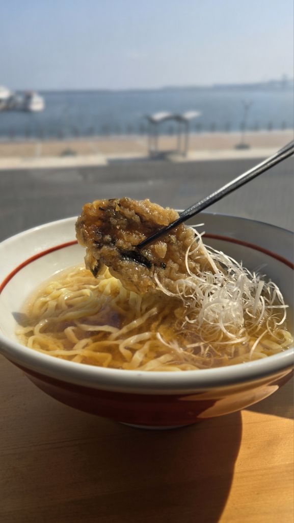 いわきの魚メヒカリを蒲焼にして特性甘辛たれ、潮の香りの塩ラーメンでいただく贅沢な一品。
