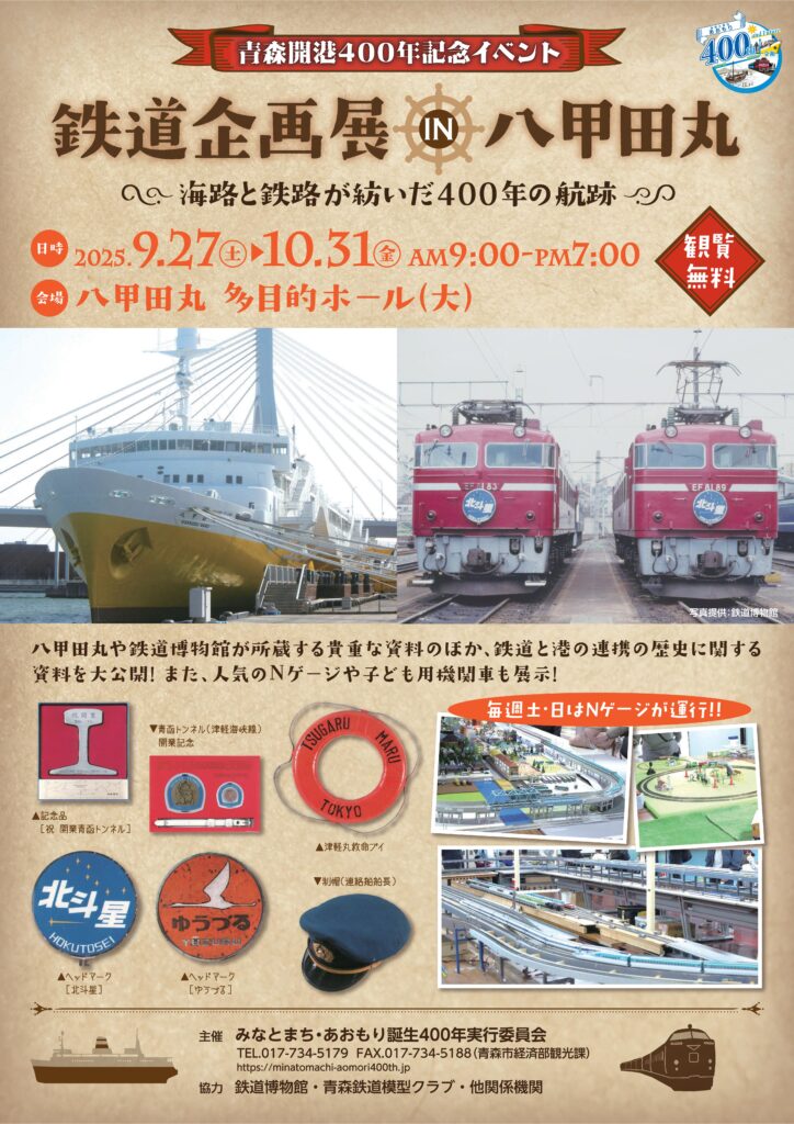 【R7事業】第16回Sea級グルメ全国大会inあおもり 魅力紹介⑤ 2025 10/02 イベント情報 終了したイベント 2025年9月22日2025年10月2日 5つ目は「鉄道企画展in八甲田丸」です!八甲田丸や鉄道博物館が所蔵する貴重な資料や鉄道と港の連携の歴史に関する資料を展示!ぜひお越しください!日時:9月27日(土)~ 10月31日(金)9:00~19:00場所:八甲田丸多目的ホール(大) イベント情報 終了したイベント よかったらシェアしてね! URLをコピーしました! URLをコピーしました! 【R7事業】Sea級グルメ全国大会inあおもりまであと5日!出店者紹介⑩ 【R7事業】Sea級グルメ全国大会inあおもりまであと3日!出店者紹介⑪ 関連記事 【R8事業】祝!🎊青森市で第84期名人戦七番勝負が開催されます! 2026年2月6日 【R7事業】青森開港400年記念イベントスケジュール ※12/24更新 2025年12月24日 【R7事業】青森開港400年記念第26回青森県将棋グランドチャンピオン戦 2025年12月16日 【R7事業】青森開港400年記念シンポジウム 開催しました 2025年12月15日 【R7事業】青森開港400年記念シンポジウム開催 事前申込、絶賛受付中! ※12/3更新 2025年12月3日 【R7事業】『ポート・オブ・ザ・イヤー2025』 青森港への投票をお願いします! 2025年10月16日 【R7事業】青森みなと400年ものがたり放送決定! 2025年10月2日 【R7事業】第16回Sea級グルメ全国大会inあおもり開催! 2025年10月2日