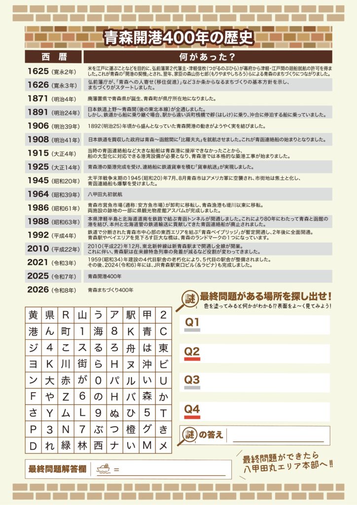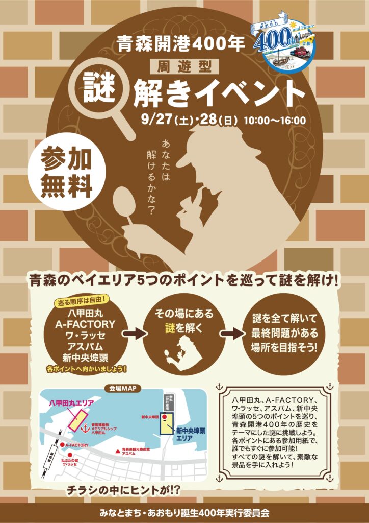 8つ目は「開港400年謎解きイベント」です! 青森のベイエリア(八甲田丸、A-FACTORY、ワ・ラッセ、アスパム、新中央埠頭)の5つのポイントを巡って、青森開港400年の歴史をテーマにした謎に挑戦。全ての謎を解くと、素敵な景品も!謎解きに困ったら、八甲田丸エリアと新中央埠頭エリアの本部までお越しください!ヒントがもらえます!